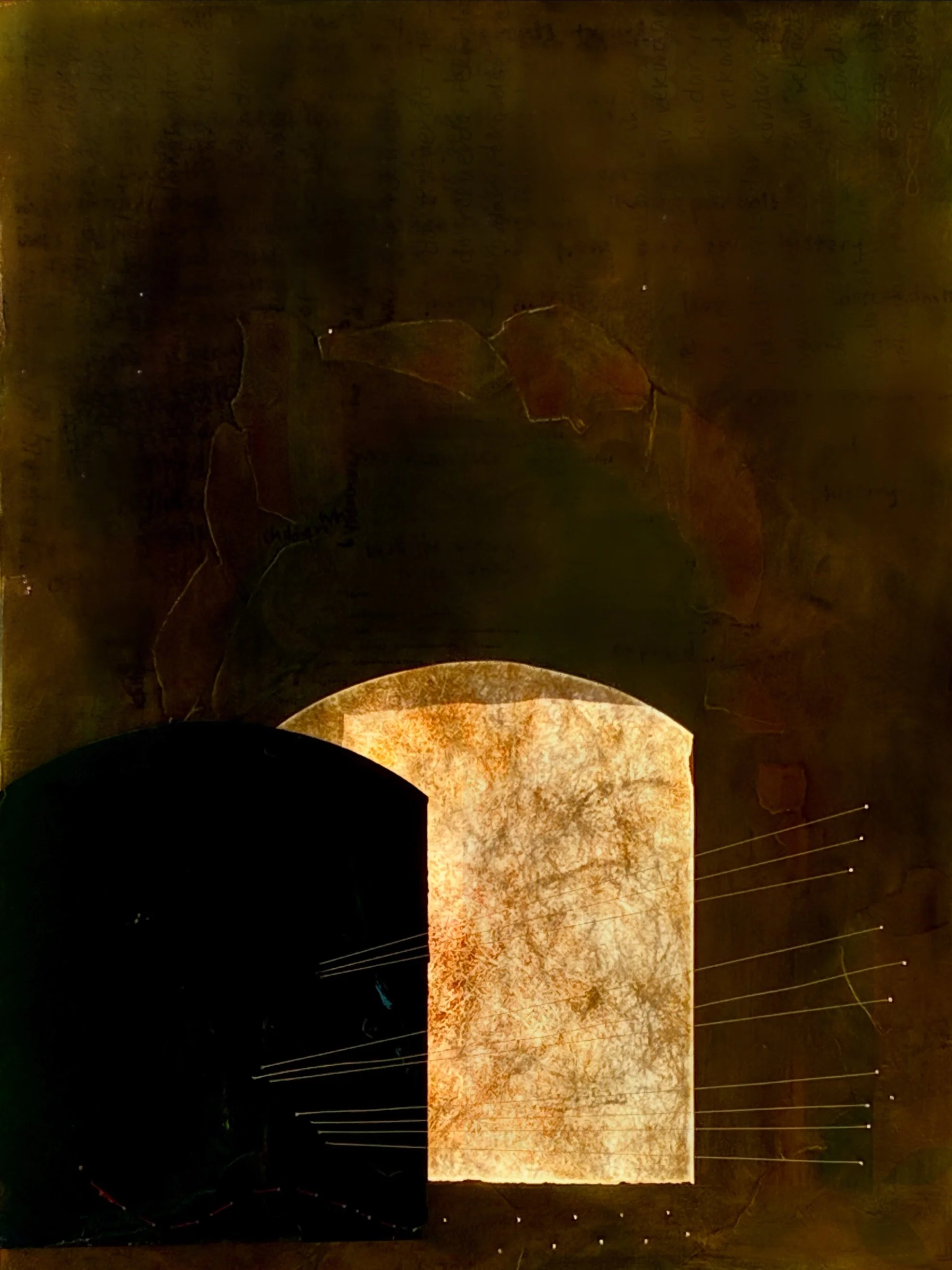 Neilah, 2025. Photograph of an ephemeral piece in gouache, acrylic, oil, and embroidery on Tyvek and Rives BFK paper, 24" x 18." This painting was partially inspired by the last section of this essay by Natasha Gill.