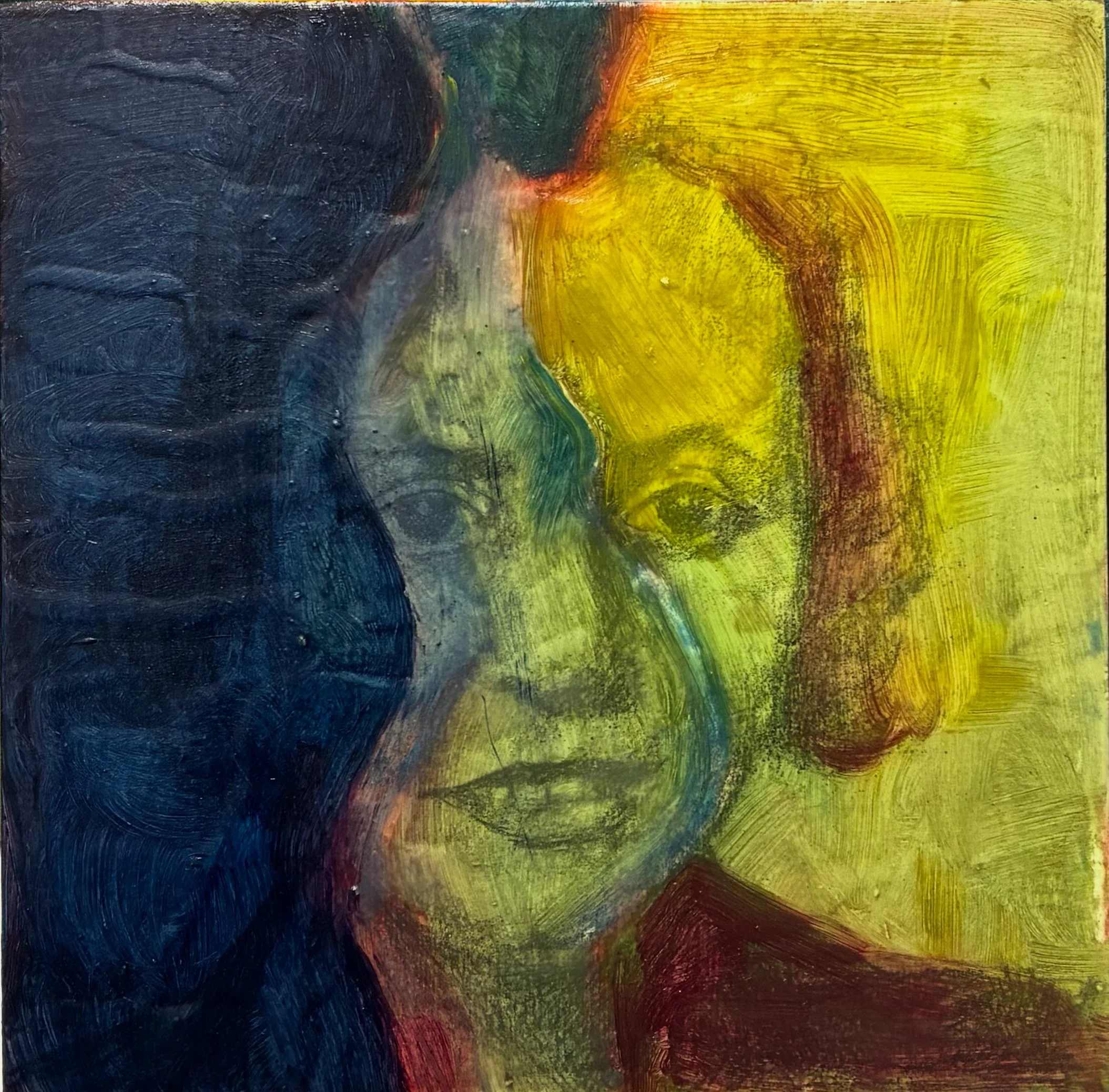 Us, 2025. Pencil, acrylic medium, and oil on panel, 6" x 6".