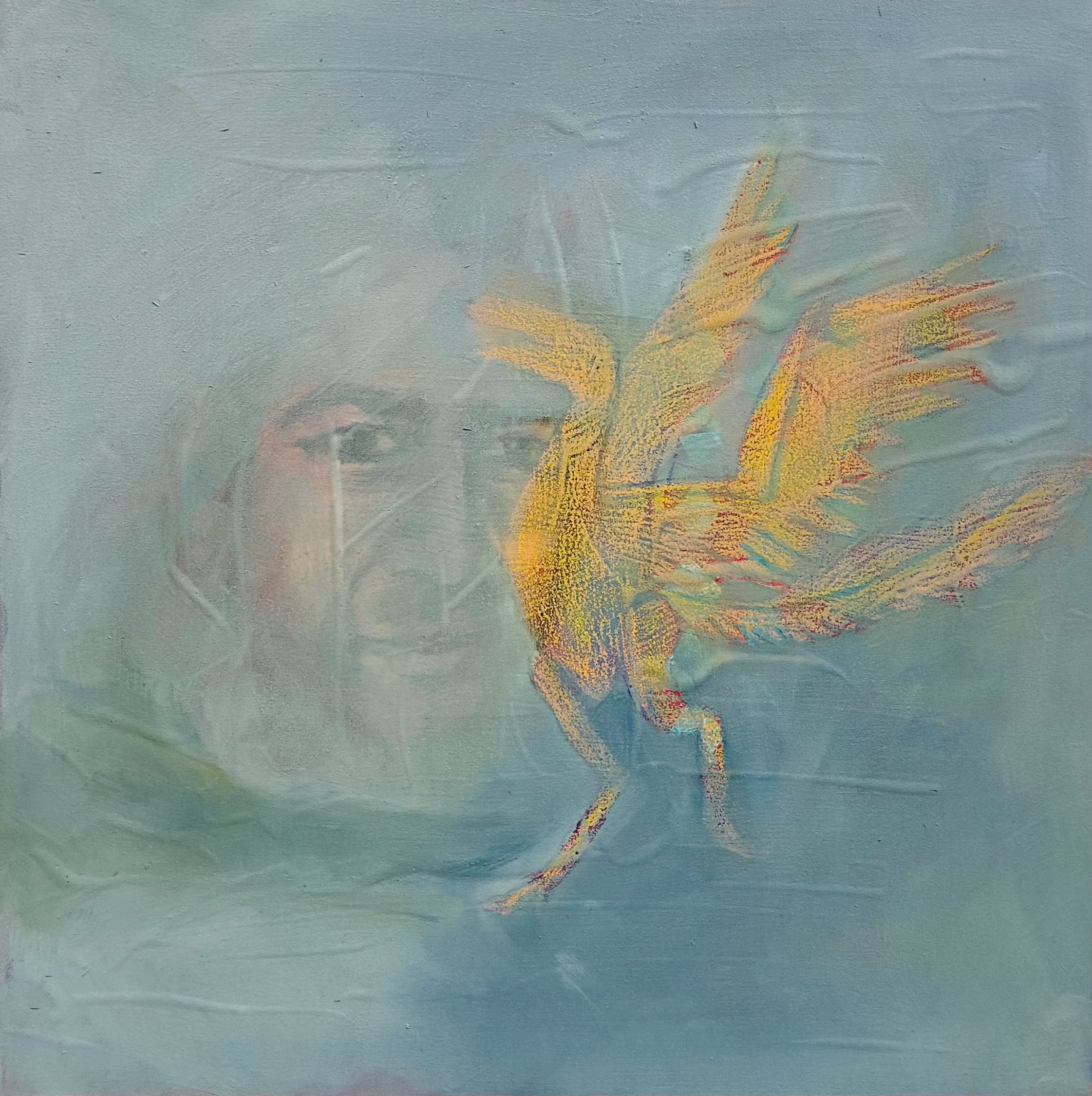 My Archaeopteryx, 2025. Pencil, gouache, colored pencil, and oil on panel, 12" x 12".